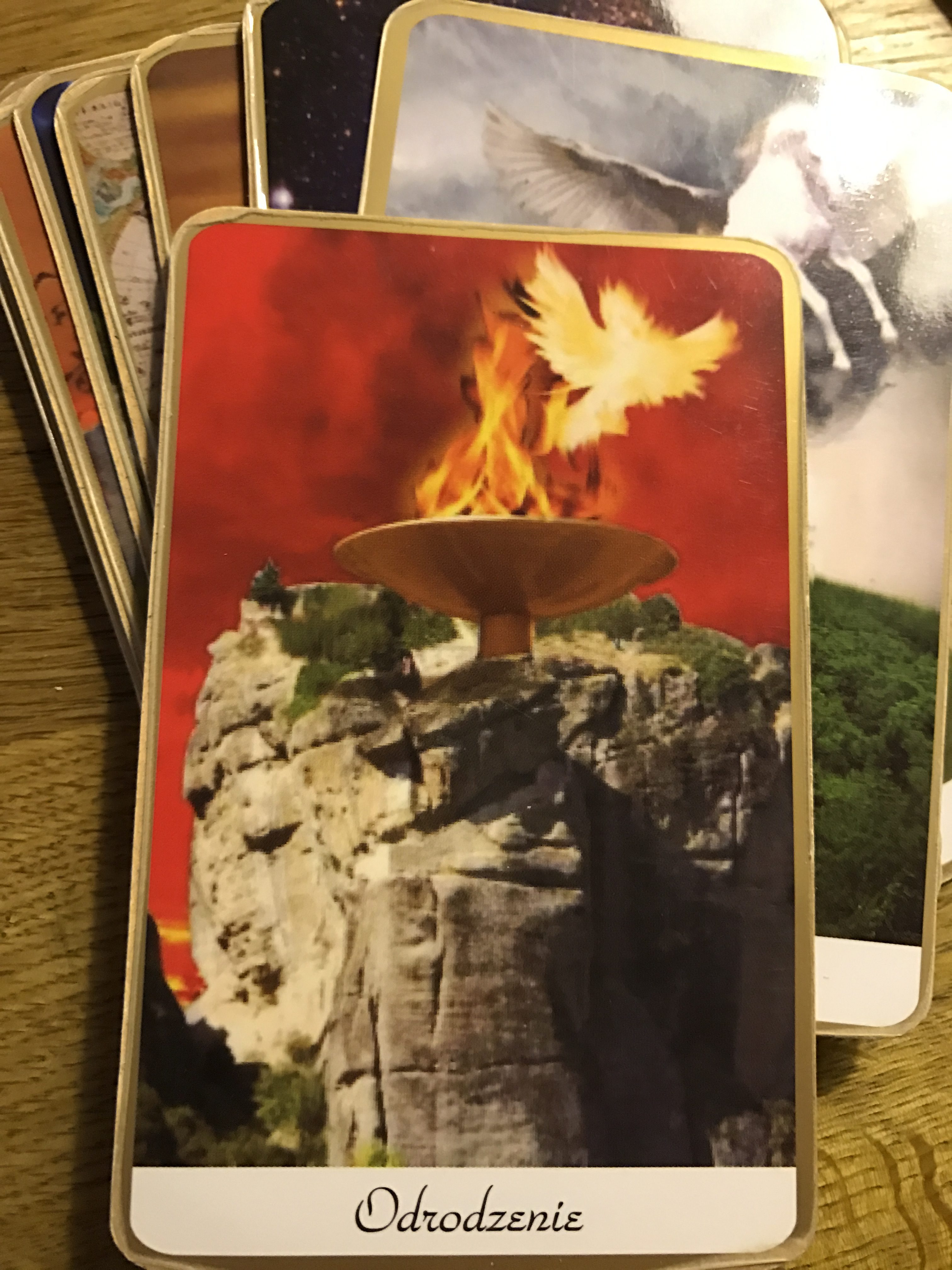 Karta Odrodzenie symbolizuje jeden z żywiołów jaki jest Ogień. Żywioł ten przedstawiony jest na karcie jako płonąca Pochodnia z której wyfrunął odrodzony Feniks – mistyczny ptak spłonąwszy w ogniu poświęcenia, który ponownie odradza się z popiołów. W dawnych legendach wierzono, że Aniołowie użyczyli Feniksowi swoich skrzydeł i dzięki temu mają Z nim ciągły kontakt. Ludzie przypisywali Feniksowi wielkie moce i czcili go w swoich religiach. Feniks symbolizuje Ogniwo śmierci i odnowę życia , a także wypalenie Karmy ,transformację i zapowiada że doświadczymy działania niewidzialnej siły. Karma utrzymuje że wszystko co robimy drugiemu człowiekowi wróci do nas . Skrzydła symbolizują harmonię z powietrzem, co dla człowieka oznacza panowanie nad emocjami i umiejętne ich poskromienie. Potencjałem tej karty jest pozytywny ładunek ,,wznoszący ,, człowieka mówiące o tym, że aby mogło się coś narodzić stary musi umrzeć wypalić się…